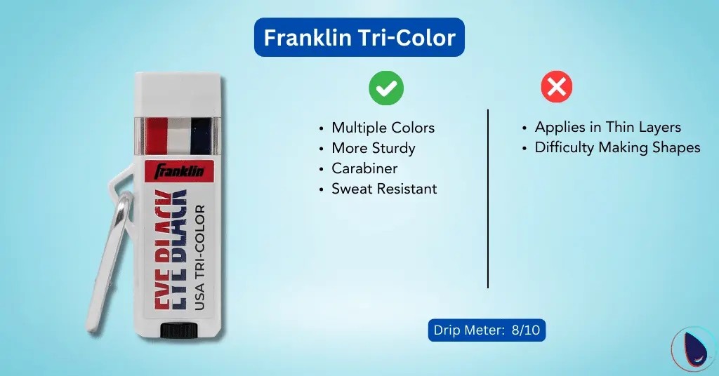 Franklin Sports eye black stick comes in handy for game day when you want to have a detailed design. Using the thin point you can make creative designs as seen here. The quality of the eye black isn’t as durable as other products, but can get the job done.